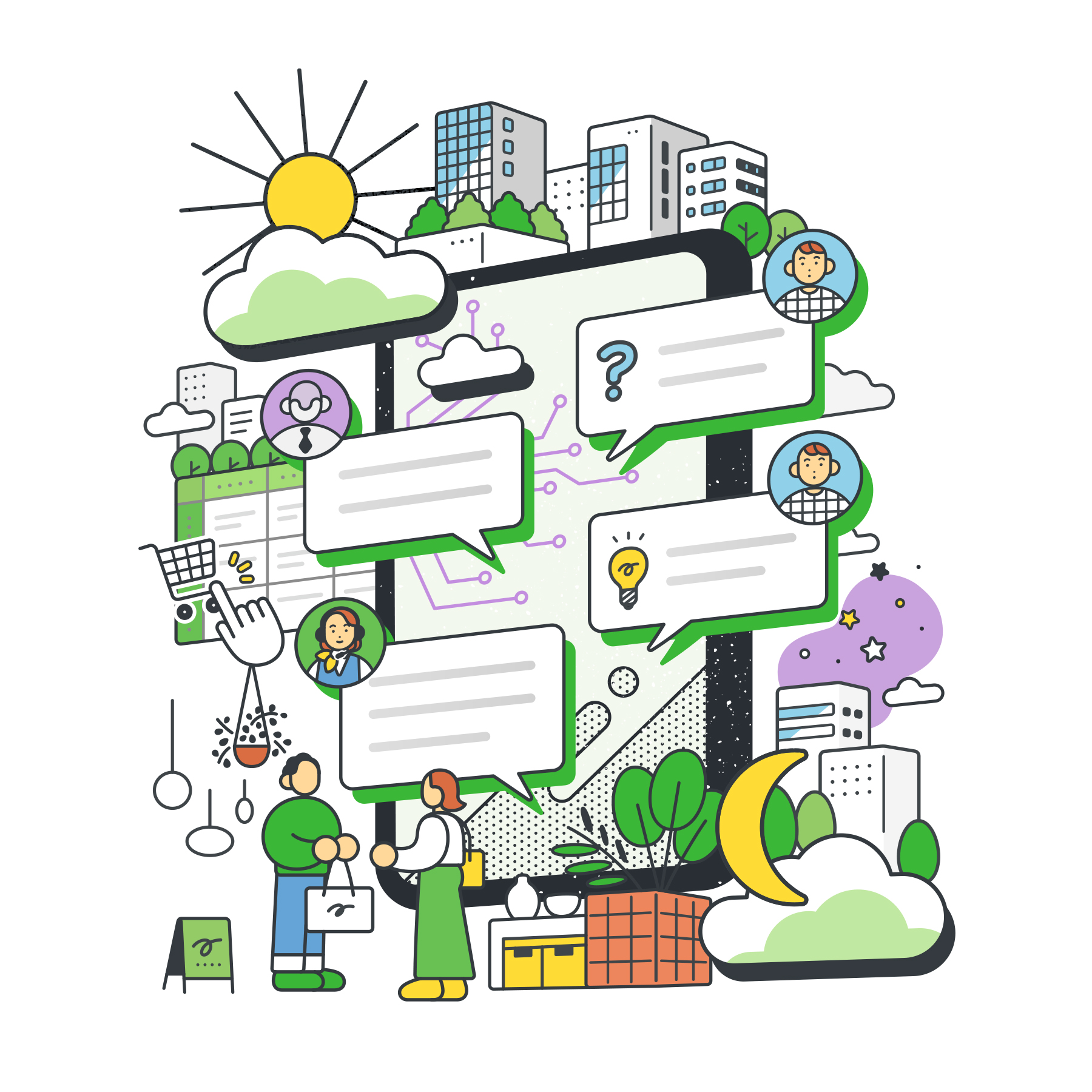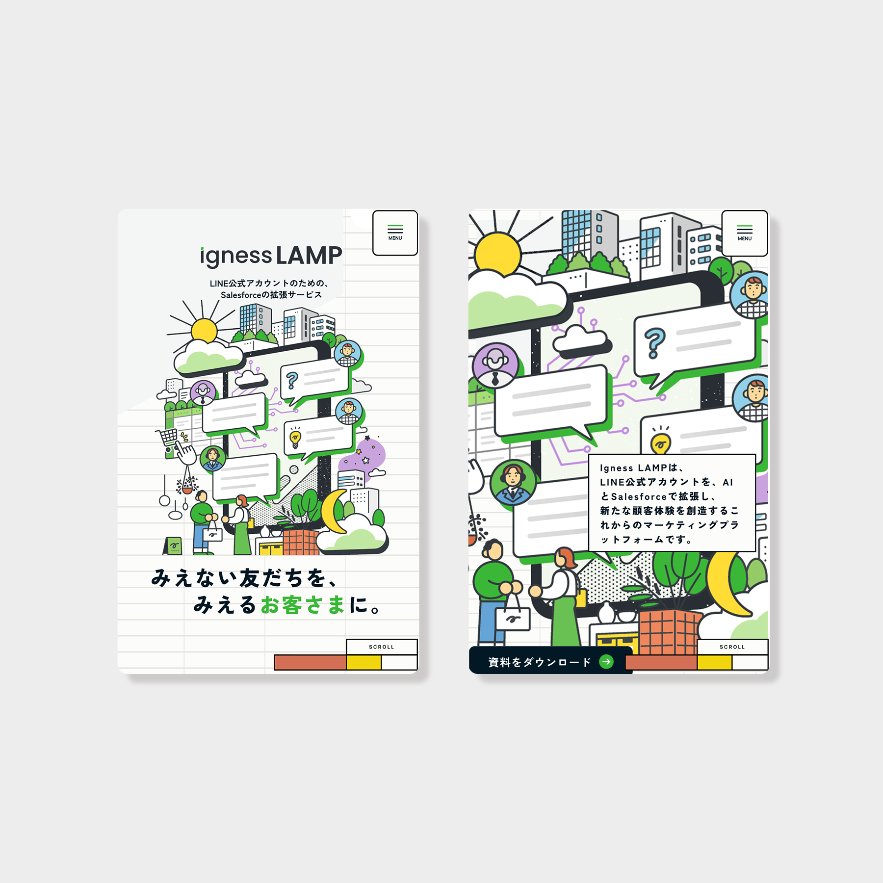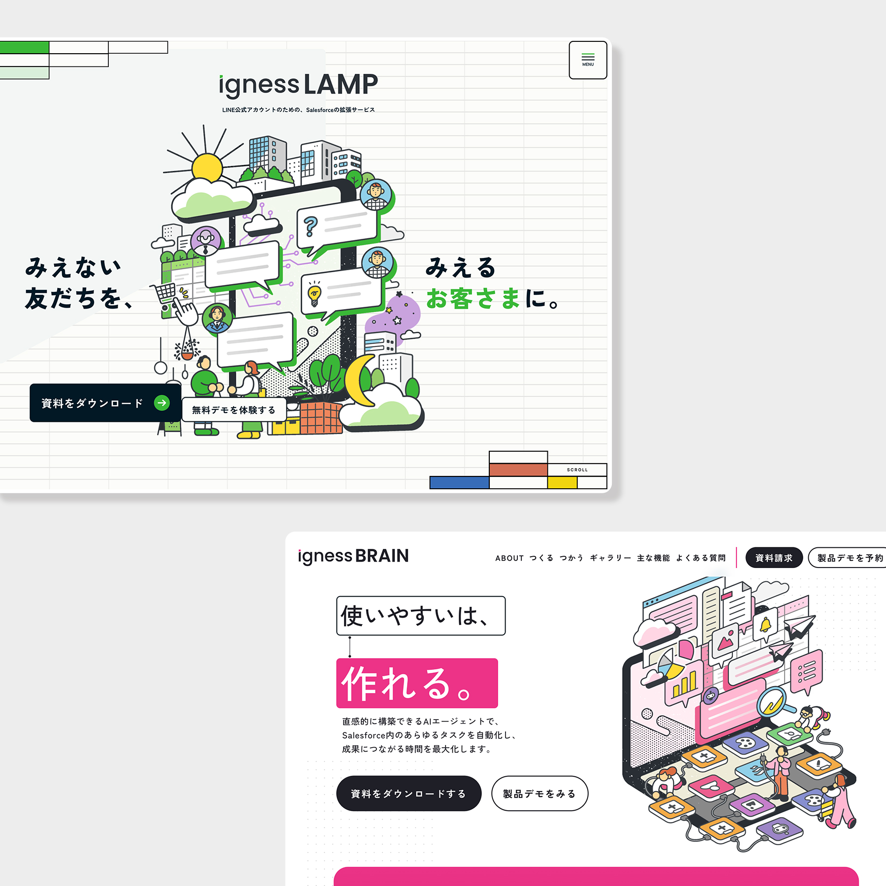 AIエージェントを“無機質な高機能技術”としてではなく、使う人に寄り添い、疑問を「?」から「!」へ導く存在として描くことを意識しています。実際のUIも意識しつつ、「自分でも扱えそう」「組み立てながら使える」といったワクワク感と、創造的な仕事をサポートするイラストを目指しました。